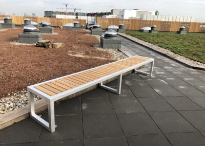 For the showpiece of this stunning space, we were asked to design a multipurpose large timber photo frame bench, to allow customers to take a selfie with the dramatic London skyline perfectly framed. This needed a strong internal structure hidden from view and in keeping with the Campus timber street furniture was clad in timber slats to produce a striking but sympathetic focal point to the space.